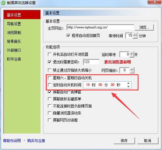在功能设置里面选中自动关机即可实现触摸屏自动关机,可根据需要设定自动关机的时间;如周末不开机,选中“星期六、星期天自动关机”即可。