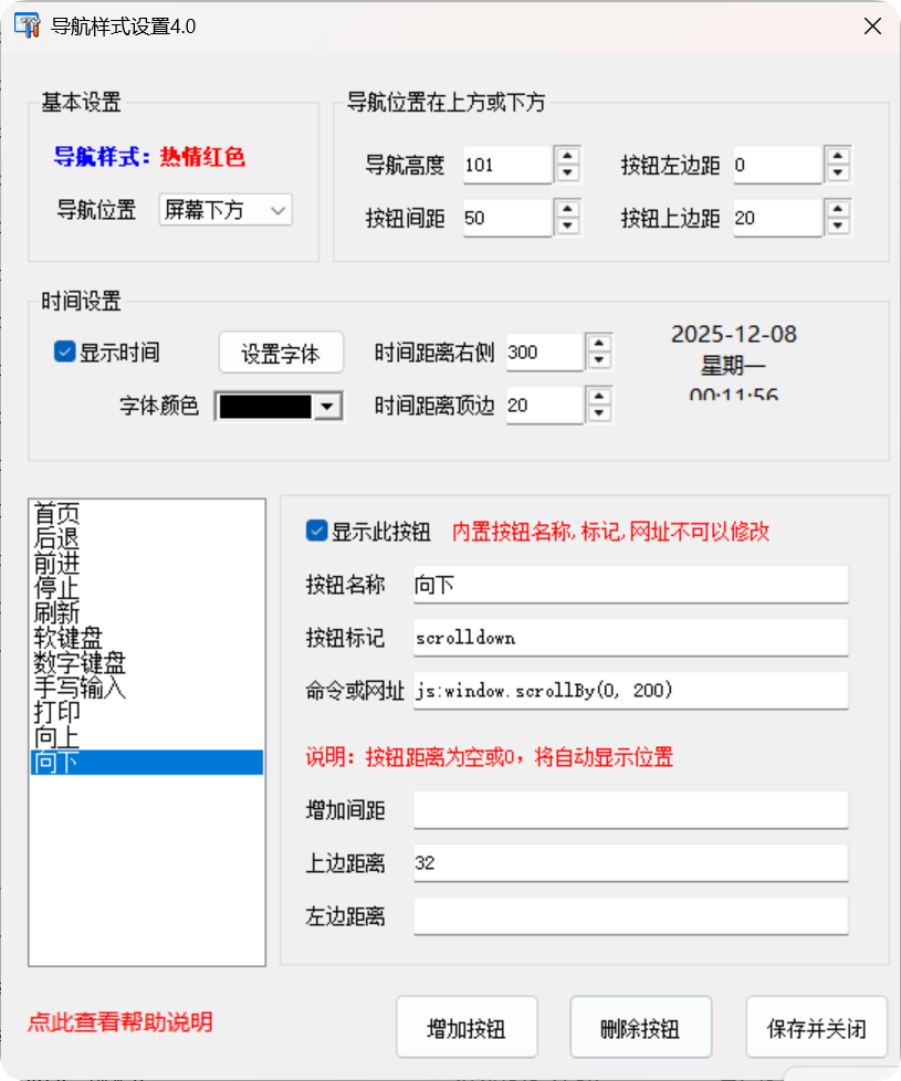 按钮名称:向下,按钮标记:scrolldown ,命令或网址:js:window.scrollBy(0, 200)