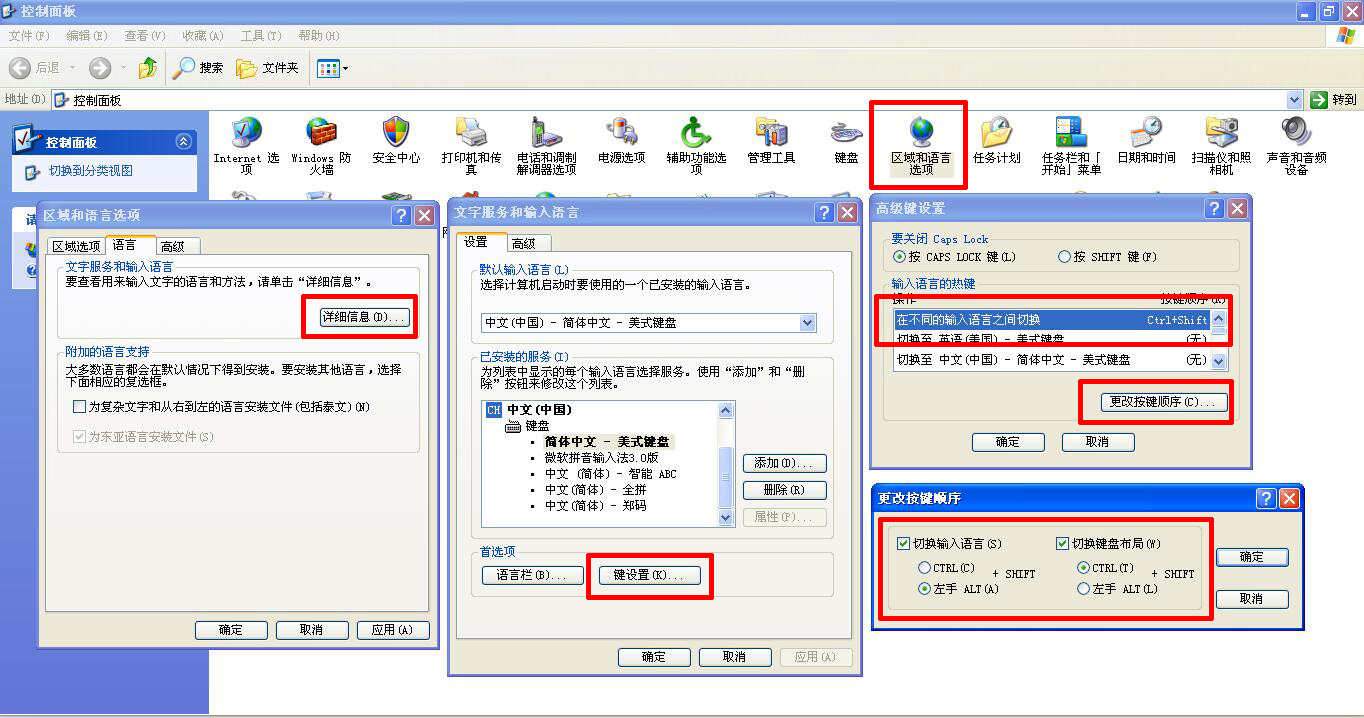 - 如果Ctrl+Shift切换中文输入法不成功,请通过如下步骤恢复到默认设置:控制面板 -> 区域与语言选项 -> 语言 -> 详细信息 -> 键设置(选择在不同的输入语言之间切换)更改按键顺序 -> 选中切换输入语言(如果不行重新打开选择切换键盘布局) -> 选择Ctrl+Shift -> 确定。